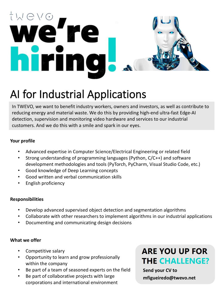 We are hiring, for AI in Industrial ApplicationsPosted on May 29, 2023May 29, 2023 by TWEVOSend your CV to Mónica Figueiredo, via email (mfigueiredo@twevo.net).#digitalfactory, #i40, #industria40, #industry40