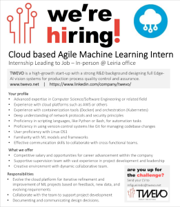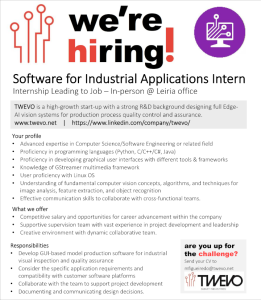 If you are interested, please see all details in the attached images. If you feel that you are up to the challenge, want to make part of an exciting and diverse team, dealing with AI to improve factory working conditions and reduce waste, send your CV to Mónica Figueiredo via email (mfigueiredo@twevo.net).