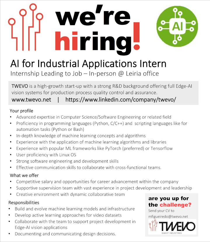 If you are interested, please see all details in the attached images. If you feel that you are up to the challenge, want to make part of an exciting and diverse team, dealing with AI to improve factory working conditions and reduce waste, send your CV to Mónica Figueiredo via email (mfigueiredo@twevo.net).